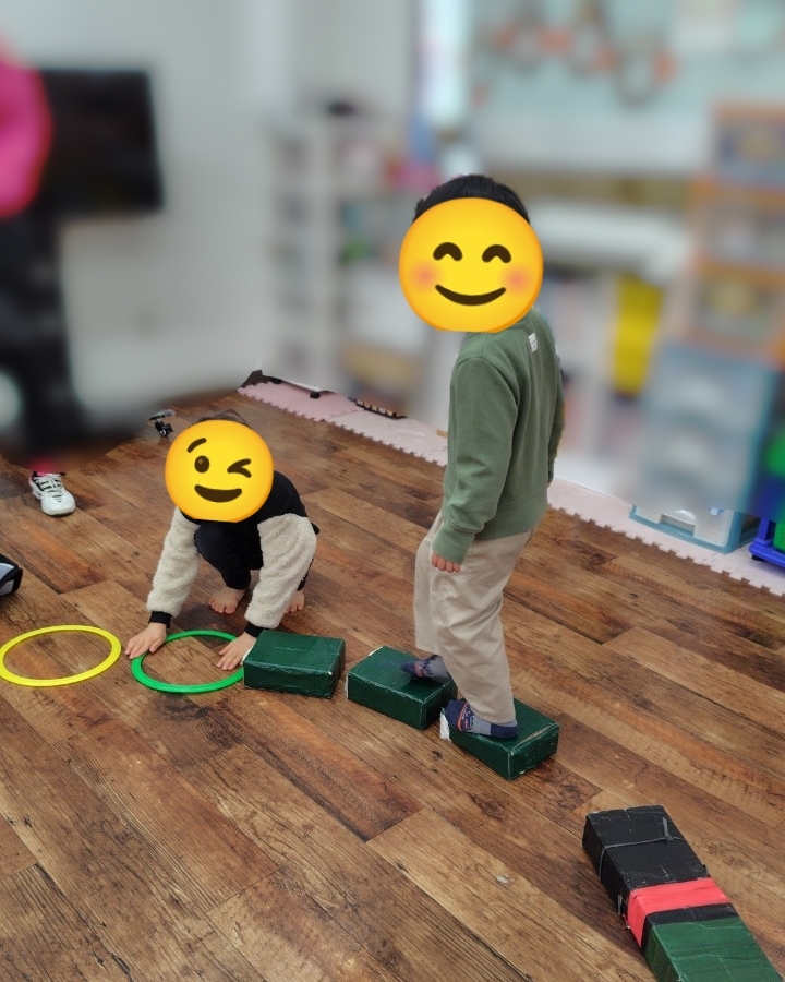 ご来所のお友達は、サーキットに沿って、先生と手をつないでトランポリンを跳んだり、なぞなぞに素早く答えたりして、意欲的に取り組んでいました✊